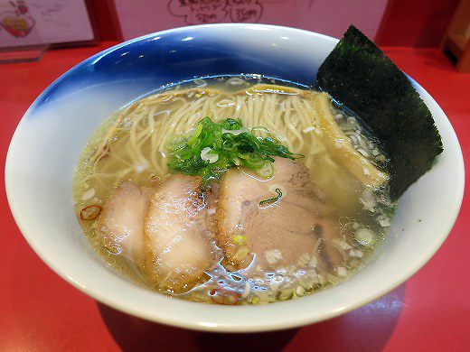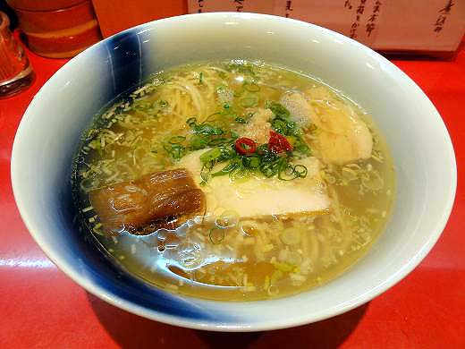 スープは鶏ガラ豚ベースの魚介塩味。麺は平打ちの中細ストレート麺。具はウデ肉のチャーシュー,ネギ,刻み白ネギ,穂先メンマ,海苔,鷹の爪を使用。地鶏・黒豚出汁に魚介出汁を合わせたスープにやや多めの鶏油を加え、ほのかな鷹の爪のピリ辛感をアクセントに引き締まった塩タレでキレのある味わいで、コクと深みのある仕上がりになっています。麺は自家製麺でしなやかなコシがあり滑らかな表面で喉越しよく頂けます。中ぶりのチャーシューが3枚入っていて、程よい弾力感があり肉の旨みが良く味わえとても美味しく頂けます。