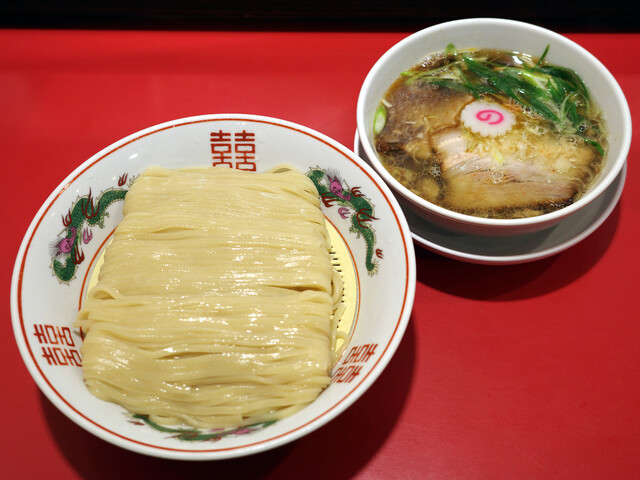 新年2杯目はこちらの『つけそば 並』を頂きました。稲垣種鶏場の名古屋コーチン・鹿児島純粋黒豚の霧島高原ロイヤルポーク出汁に羅臼昆布・ムロアジ・ホタテ貝柱・鮭節等の魚介を合わせたスープにやや多めの鶏油で厚みをもたせ、和歌山県産の野尻醤油・兵庫県産のヒシモ醤油を使ったカエシで、芳醇な醤油の旨みにほのかな甘みと辛みの中に酸味をバランスよく合わせた味わいで、鶏の旨みに魚介出汁でコクをもたせた深みのある仕上がりになっています。麺は江別製粉のはゆたかを軸に九州産チクゴイズミ等をブレンドした自家製麺を使用し、しなやかさの中に跳ね返りのあるコシ感があり艶やかな表面で小麦風味が豊かな味わいで頂けます。大ぶりのバラ肉が1枚と中ぶりのウデ肉が2枚に細切れ状のウデ肉が多数入っていて、それぞれの肉質感と肉の旨みがよく味わえとても美味しく頂けます。備付の黒胡椒で味の変化を楽します。ご厚意で冷しのそばつゆを頂きました。麺の旨みを違った食感で楽しめます。