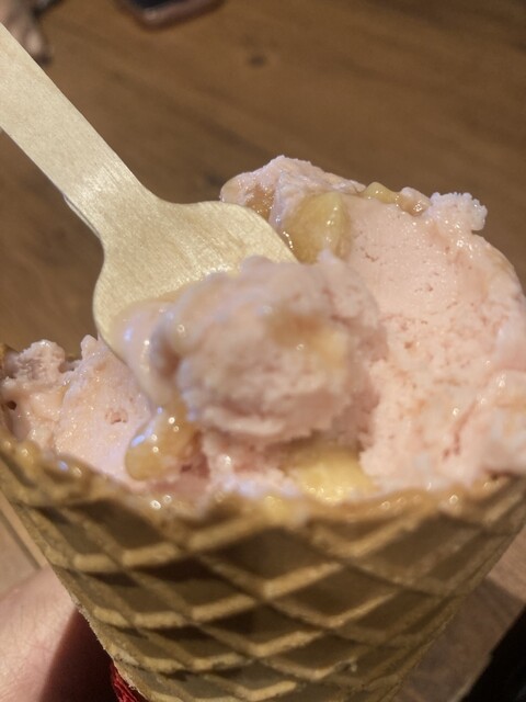 いつも混み合っていて一度はチャレンジしたいと思っていたジェラート屋、CREMAHOPさん… 数名で訪問も冬でも、正月でも混んでます。並びこそなく、店内座席も確保できたので発注へ、まずはステップ1でサイズ選択!全員ダブル!次はカップ類、ダブルはカップか+50円のワッフルコーンの二択にて、ワッフルコーンチョイス!支払いはクレカ、QR可能、支払い後はテイスティング!嬉しい!最初は期間限定の富士山の日本酒と味噌ケーキ、0.1%のアルコールと言われましたが、美味で日本酒感はなくいい!続いても期間限定の青森林檎のキャラメリゼ、粒キャラメルがアクセントで激ウマ!ラストテイスティングはチョコレートシュプリーム!激濃厚!旨し!そして、ダブルは青森林檎のキャラメリゼとピーナッツバナナをチョイス!青森林檎はテイスティングの勝利!ピーナッツバナナはラムレーズンと悩みに悩み、期間限定のピーナッツバナナに軍配!盛り付け順も聞かれ、青森林檎を上、下にピーナッツバナナにしました。ピーナッツバナナは多分かなり甘いと想定での順番です。出来上がりを持って座席へ… まずは青森林檎のキャラメリゼから食します。やっぱり激ウマ!サッパリ林檎に甘く食感あるキャラメルがいい!ずっと食べていたい!!次はピーナッツバナナ!やっぱり甘い!が美味い!食べ進めるとピーナッツの圧勝感、バナナ感が薄れるもギリギリの飽きのこない甘さでワッフルコーンと食していくとちょうどいい!あっという間に完食してしまった!また来たい!素直に思う旨し名店だ。ご馳走様でした!