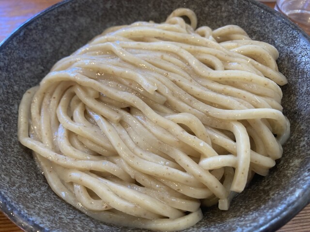 福島ランチは久々、おすすめしてもらったえなみさんへ。11時半で満席にて待ちもすぐに席が空き入店。メニュー左上は塩ラーメンだがつけ麺の評判がよくチョイス!魚介豚骨つけ麺950円を並サイズで発注!熱盛も出来るとのことでしたが冷盛に。麺量は後から気付くも並500g、小350gとのこと。ちょっと待ちましたがつけ麺だし太麺だし仕方なし。先につけ汁、次に麺が着丼!早速ゴングが鳴り響き食します。うどんのような風貌の極太麺をつけ汁投入して啜り上げると甘め汁が絡んだ激ウマ麺が味わえます。魚粉を溶かし込み麺をたっぷり漬けて食し、あまりの美味しさに感動!つけ汁には太メンマ、カットされたチャーシュー、なるとなどが入っていて麺と合わせ食べするも、やっぱりつけ汁自体のパンチが凄すぎ!つけ汁に味を引っ張られます。麺量500gもなかなか減らないですが、旨さが上回りすぎて苦にならない。ガンガン食べ進めつけ汁もだいぶ減り、汁内具材を平らげ、お酢投入して味見!これも旨し!甘めに酸味って激ウマです。危険すぎて完飲せずに完食!近年最強つけ麺発見に大満足!ご馳走様でした!