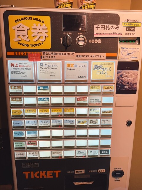 水、紙エプロン、ウェットティッシュは券売機横からセルフ、連食禁止です。