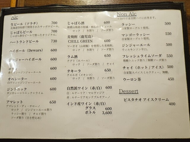 バターチキンカレー(甘口。トマトベースでクリーミー)、南インドの海老カレー(小辛。ココナッツベース)、スパイシーマトンカレー(中辛。インドカレー王道の味)、キャベツのアチャール。