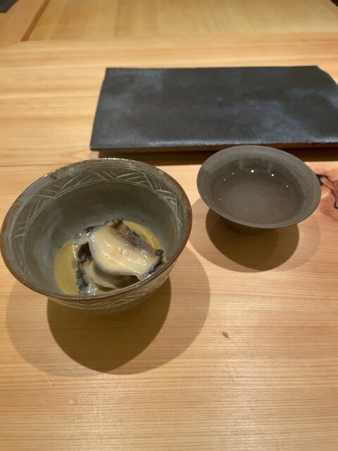 蒸し鮑を肝ソースで。 鮑を食べた後、少しのシャリを入れて肝ソースを味わう。