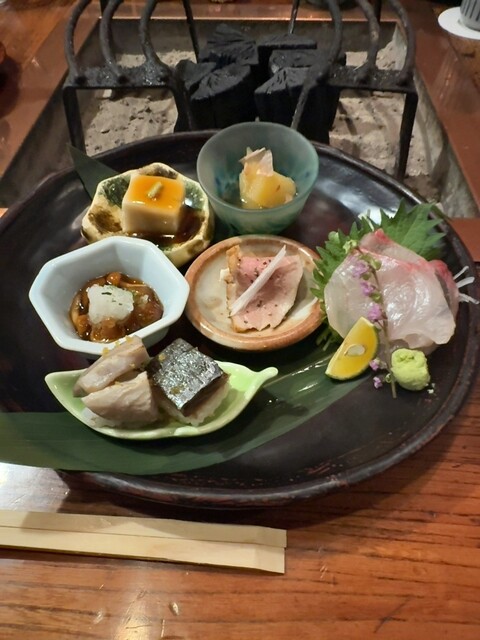 料理コースは「月山」で、味噌、前菜盛り(鯖寿司・なめこ・胡麻豆腐・数の子・鴨・カンパチ)、焼き串(玉こんにゃく・里芋・黄身で食べる鶏つくね、椎茸)、帆立焼き、牛肉朴葉焼き、香の物、板蕎麦、水羊羹。