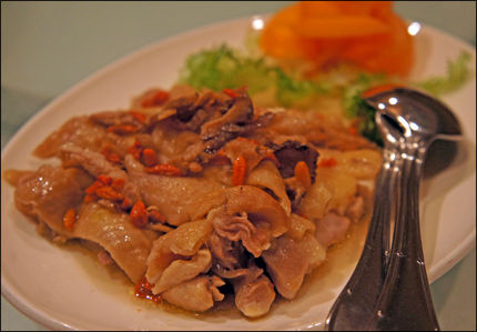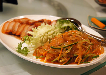 左は豚チャーシュー、右はクラゲとキュウリなどの和え物。