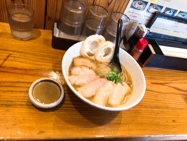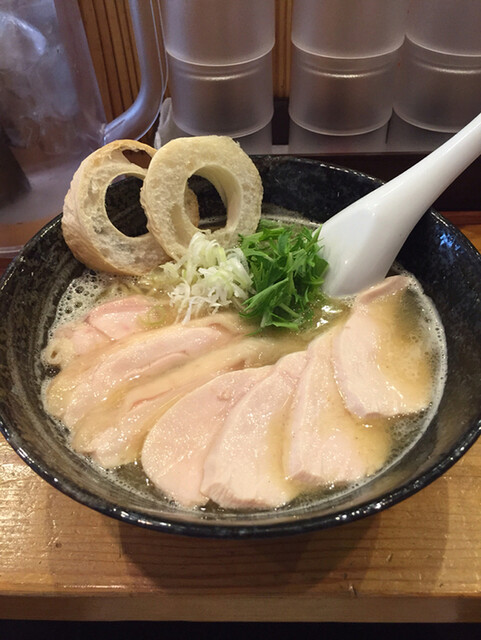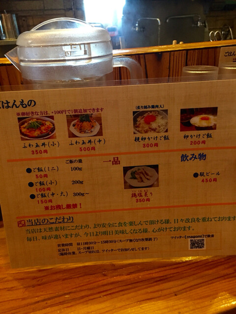 注文は、相方さんの勧めで塩ラーメン(鶏ムネ、鶏もも、豚バラチャーシュー各1枚)に。あと、2人でシェアで親卵がけご飯を1つ。