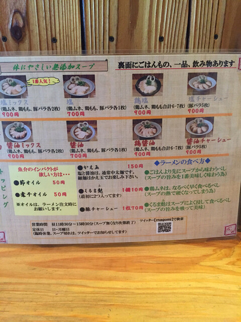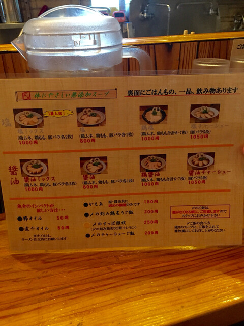 私は醤油らーめんを、旦那さんは豚チャーシューが進化したと聞いて鶏ミックス(鶏ムネ、鶏モモ、豚チャーシュー各2枚ずつのチャーシュー麺)を注文。