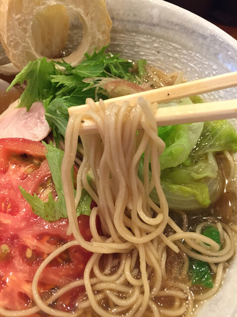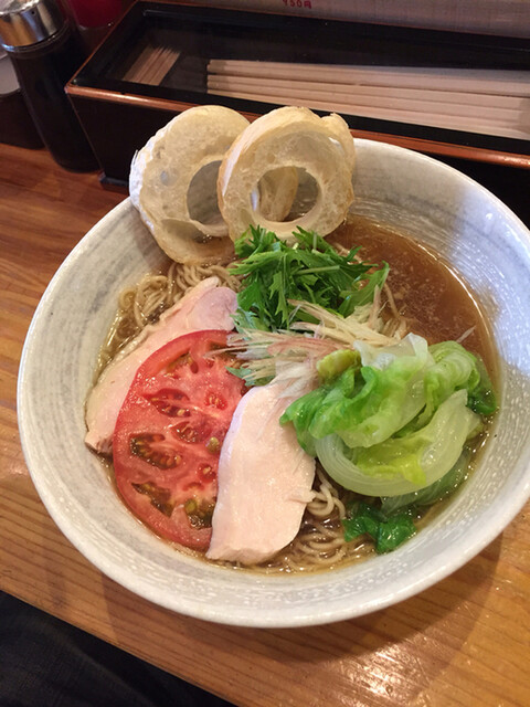 トッピングは、鶏ムネチャーシューとスライストマトとレタスにミョウガ、そして水菜と車麩です。どのトッピングも突き出ることなくって、このラーメンに融合してます。この一杯に、色んな想いの詰まった冷やしラーメンです。