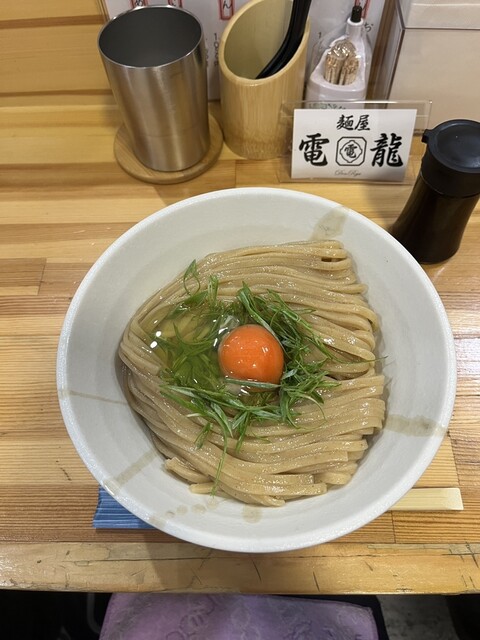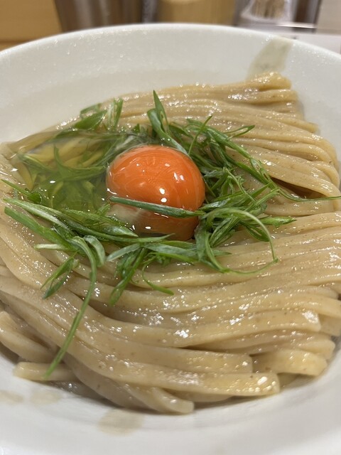 美しい麺の上には、シャキシャキ青ネギと卵黄