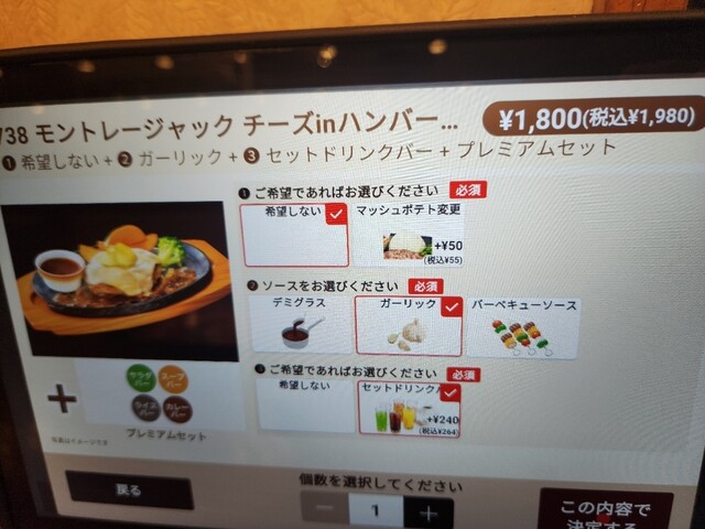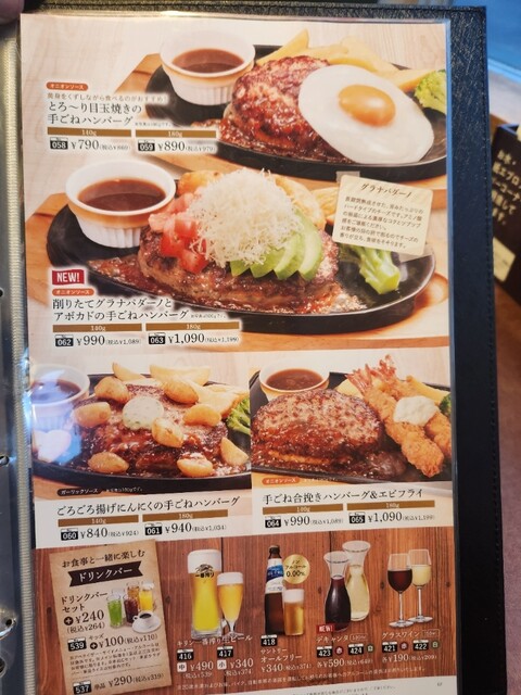 手ごねハンバーグとサーロインステーキがありますが、付け合わせにアボカドとチーズがある事から、手ごねハンバーグをキングダブルにし、Cセットにドリンクバーを付けました。