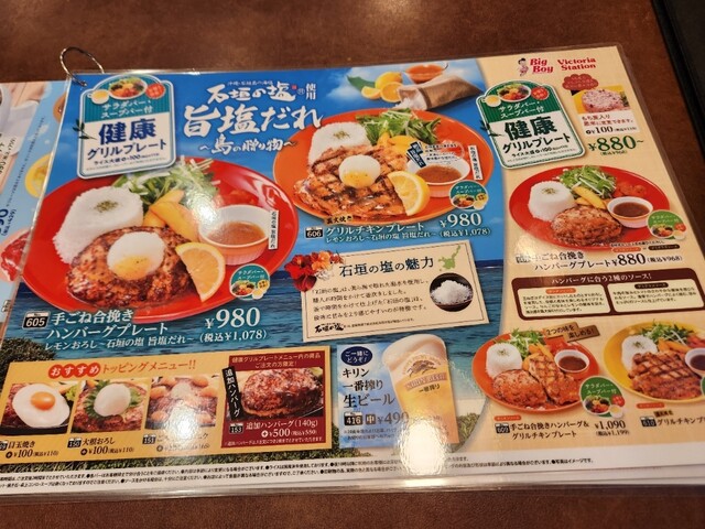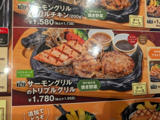 とは言え、ヴィクトリアステーションですので、フェアメニューで単品のサーモングリルもあるとは言え、モーニングの時間帯ならともかく、ランチタイムやディナータイムでハンバーグかステーキを注文しないと、ヴィクトリアステーションに来た気もしないので、「サーモングリルのトリプルグリル」の付け合わせがフライドポテトの方を注文し、プレミアムセットとドリンクバーも付けました。