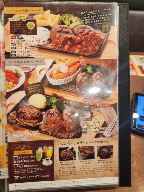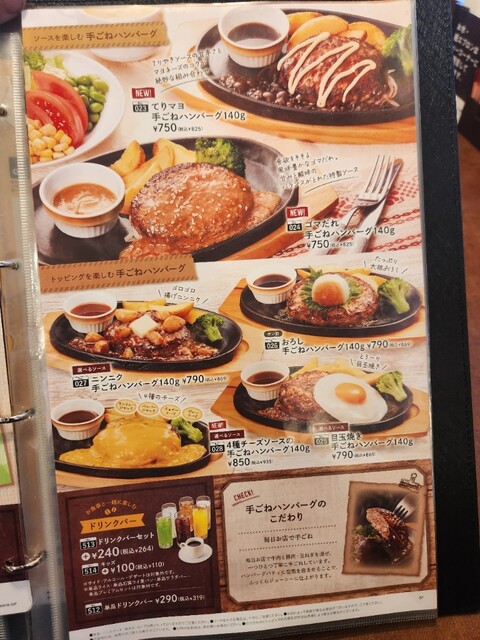 「大俵ハンバーグ200g&手ごねハンバーグ100g」にプレミアムセットとドリンクバーをつけました。リニューアル前にもあったか新メニューかはわかりませんが、初めて注文したのは間違いありません。