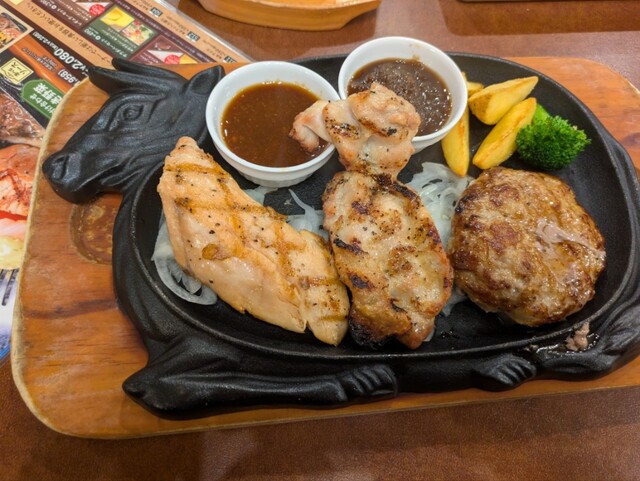 手ごねハンバーグ100グラム、グリルチキン100グラム、カットステーキ60グラムと1つ1つは少量ですが、合計で260グラムとなると結構な量になり、3種類の肉がある事により、それぞれを単品で260グラム注文するより贅沢した気分になります。