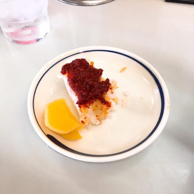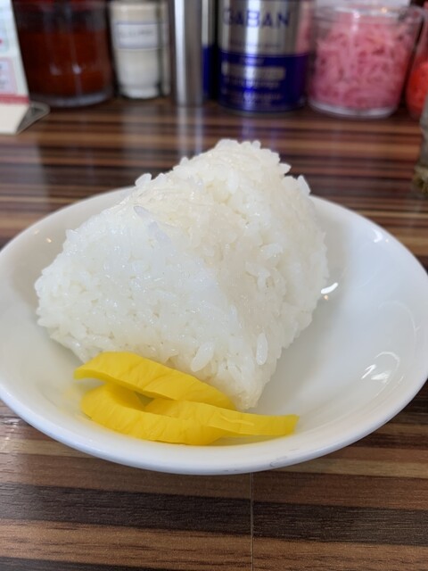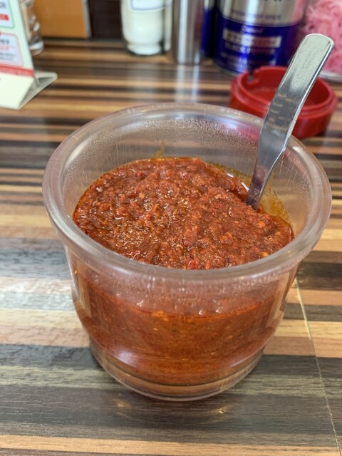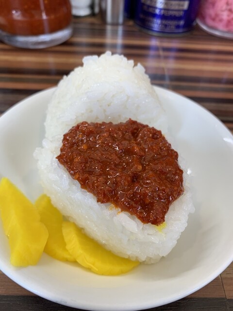 見た目ほど辛くない赤辛子をたっぷり乗せたおにぎりを食べつつ5分ほどでラーメンが提供される