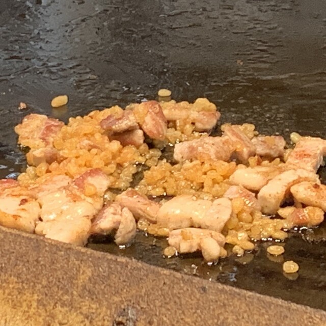 とん平焼きの中身 豚と背脂?をカリカリになるまで焼いて、油を切ってから玉子に入れる手の込みよう