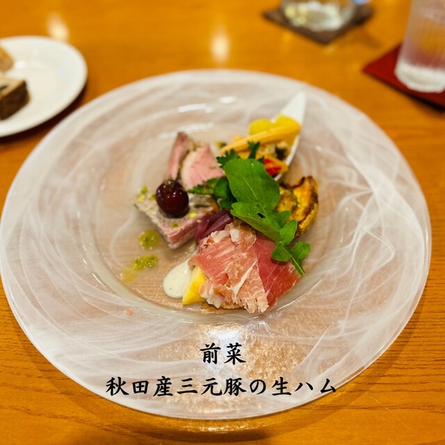 スライスする生ハムをテーブルまでシェフが持ってきて見せて下さいました。いつもは外国産の生ハムだけど、今回国産秋田県の生ハムが手に入ったそうです。