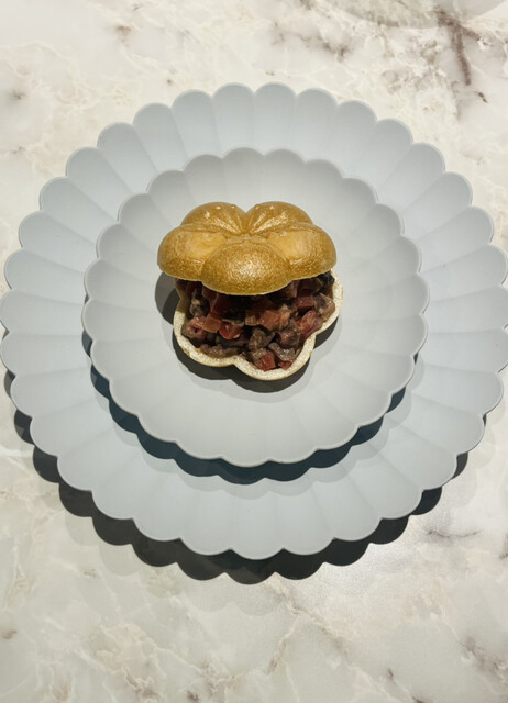 レアに焼き上げた和牛と梅酢漬けにしたたくあん