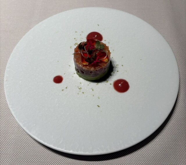 鰹のタルタル 丸いセルクルで型取り木苺と