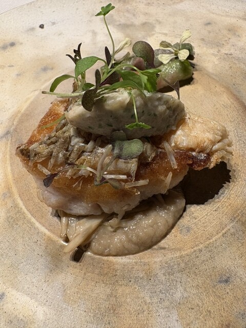 下に山形県産鳶色舞茸ピューレとソテー。