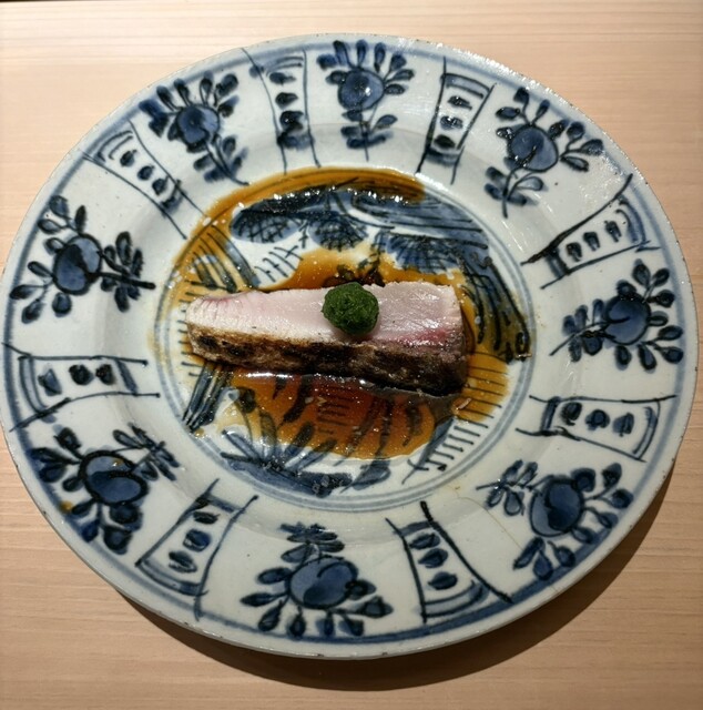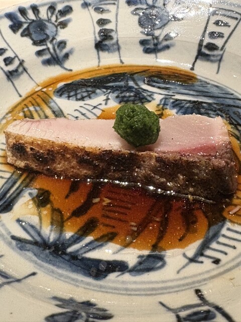 炙って甘酢、茗荷、大葉、梅肉、今治の胡麻を