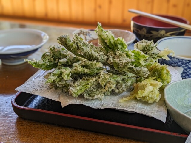 まず目を引くのは、彩り豊かな山菜の天ぷら。今回は、たらの芽、こしあぶら、ふきのとう、こごみという、まさに春の味覚のオンパレード。衣はサクサクッと軽やかで、それぞれの山菜の持ち味が生きていて、いくらでも食べられそう