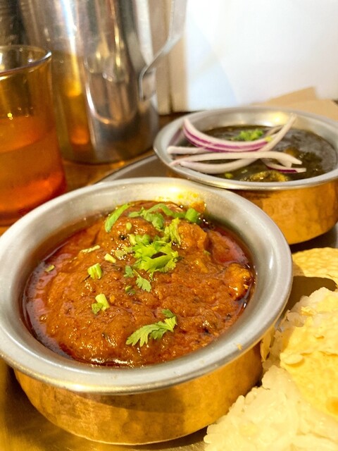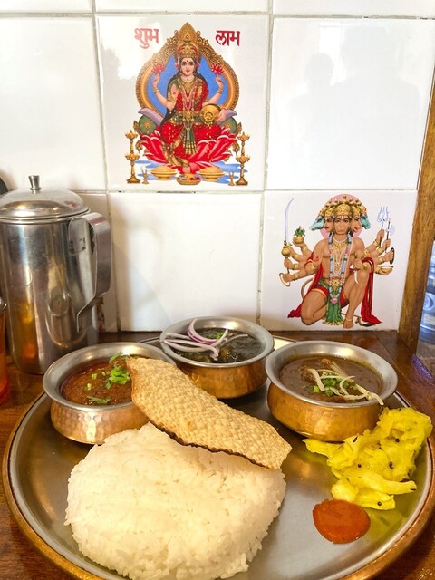 [サオジチキン]は西インド・マハラーシュトラ州のスパイスづかいで作られたもので、グレイビーな味で、辛すぎず、よい塩梅のスパイシーカリー。[ベジタブル]は冬瓜、エリンギ、モロッコインゲンなど、たっぷり入っているカリー。口の中で最後に香るスパイスはなんだったんだろう?って考えながら食べてました。帰りに聞き忘れちゃった。