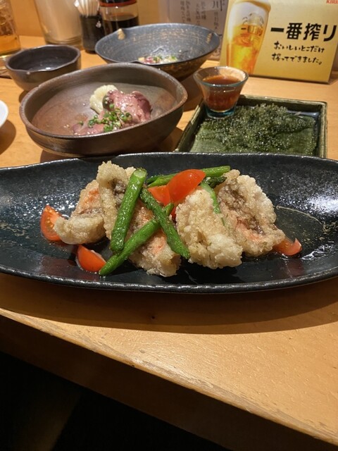 海ぶどうをポン酢でいきながら、りゅうきゅうがお目見え。にんにく風味の漬け魚初めてだったが、使ってる魚の種類も多く、かなり酒がすすむ。