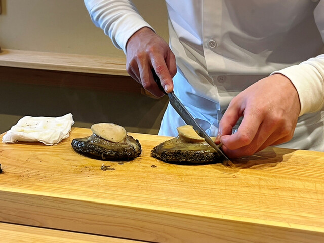 まぁ目の前で切ってる鮑の大きいこと!!