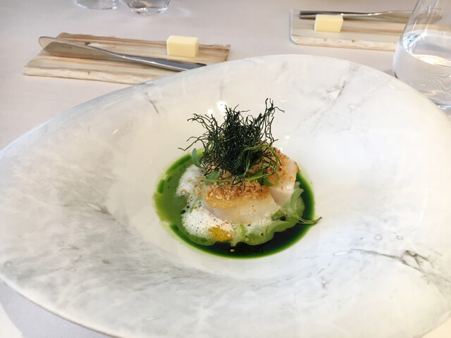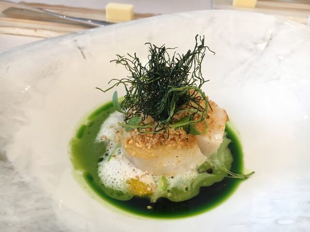 天然帆立、グリーンアスパラガス、ハーブオイル