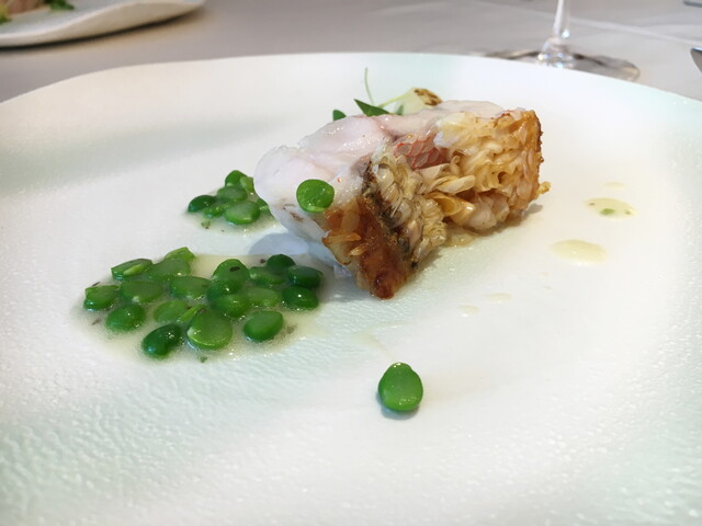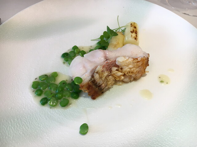 萩の甘鯛、うすい豆のソース、千葉県産のホワイトアスパラ