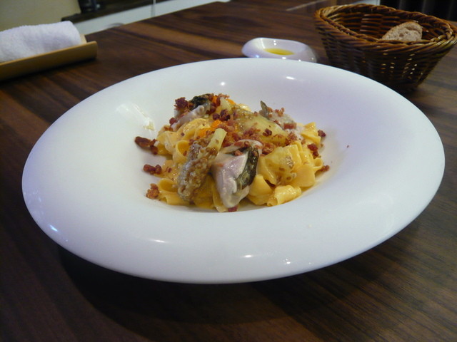 冷製カルボナーラでこんな幅広パスタとか合わせるんだ~って