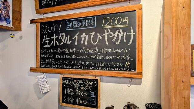 ひやかけ狙いでしたが、限定で生ホタルイカのひやかけ(税込1,200円)がありましたので、そちらと鶏天を注文。