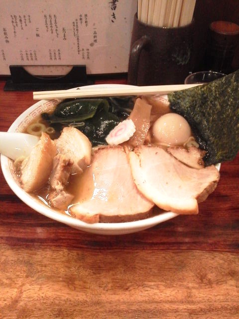 チャーシュー4枚にワカメ・味玉・メンマ・ナルト1枚海苔1枚。