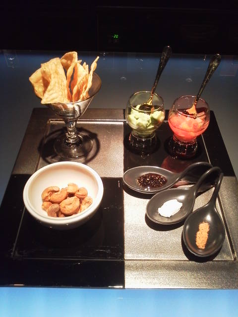つまみはスモークドカシューナッツとトルティアチップのアボガドデップとトマト添えのワンプレート。