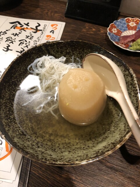 煮込み大根の唐揚げ:150円、「2分以内に食べてください、衣がシナシナになってしまうので」「でも、口の中,やけどするよ」「仕方ありません」との問答の上、ハフハフ頂きました。柚子胡椒と良くマッチ。