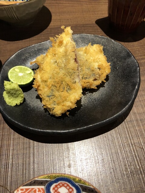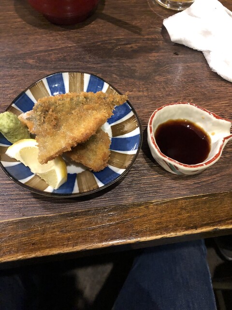 鯵フライ:490円、マストで頼む1品です。半生のフライと醤油が良くあいます。