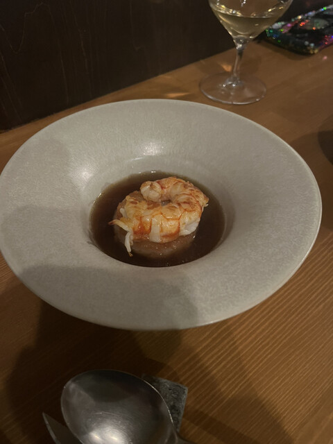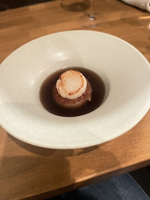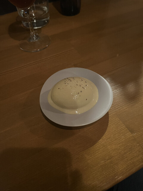 お通し:栗沢(栗山?)産、ホワイトアスパラのオランデーズソース、アスパラが甘いです。オランデーズソースも美味しい。とてもお通しとは思えません。
