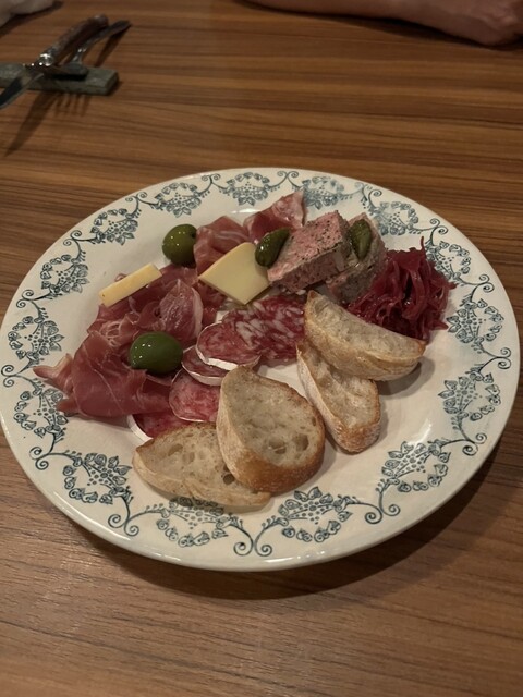 シャルキュトリー盛り合わせ:1900円、出ましたヨルトノのパン。ハム、チーズ、パテどれにも合います。