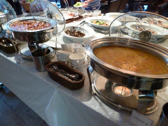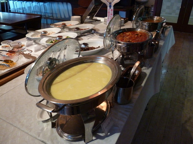 スープは3種類。手前チキンカレー、 左コーンスープ、 右ミネストローネ。