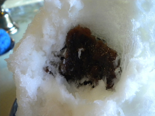 外観は真っ白~練乳の掛かった氷を食べ進んで行くと、小豆の層にまず当たります。