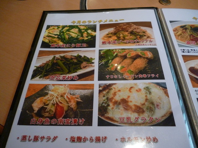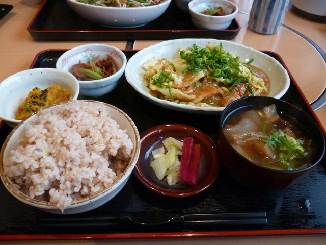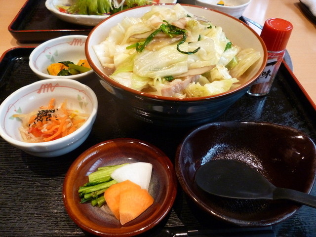 この日は、28日。。。 選んだランチは、「もつ鍋ちゃんぽん」と、「蒸し豚サラダの味噌ソースかけ」。