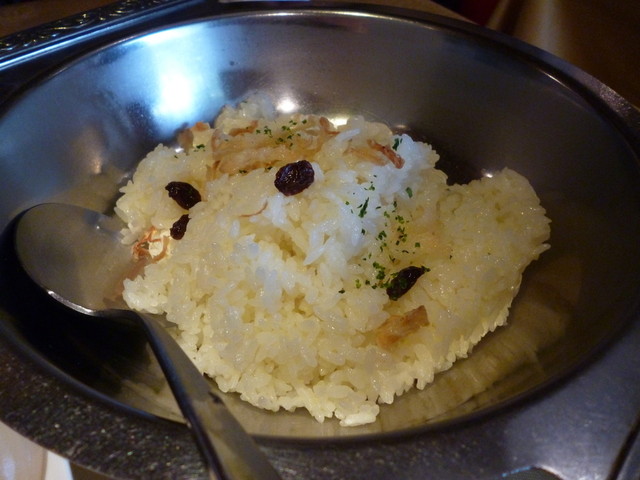 ご飯は銀色の食器に2人分入っていて、フライドオニオンとレーズンが混ざってます。パセリもパラパラ~
