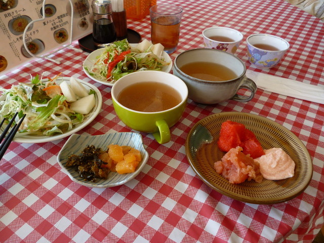 配膳が来るまでサラダとスープ、明太子各種と惣菜、果物(梨)を食べ放題~(笑)