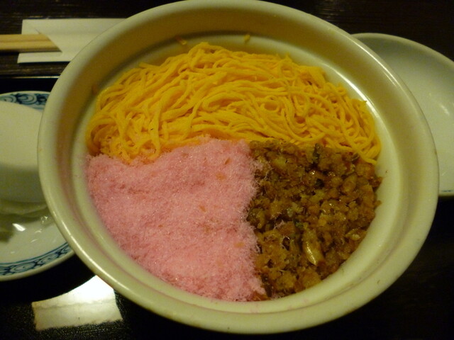 蒸し寿司は、錦糸卵と桜でんぶ、鶏そぼろが彩を添え、優しい酢飯のちらし寿司って感じです~