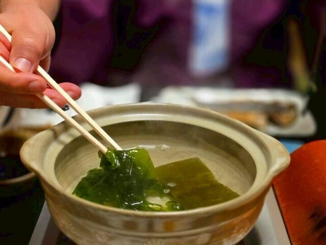 茶色だったわかめが、一瞬で鮮やかな緑に変わる。島の朝らしい、小さな驚き。