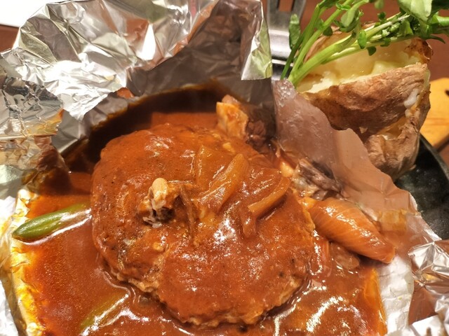ホイルに包まれた大きなハンバーグ、ちょっと苦みのあるクレソン、