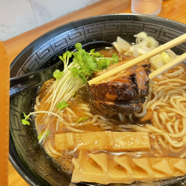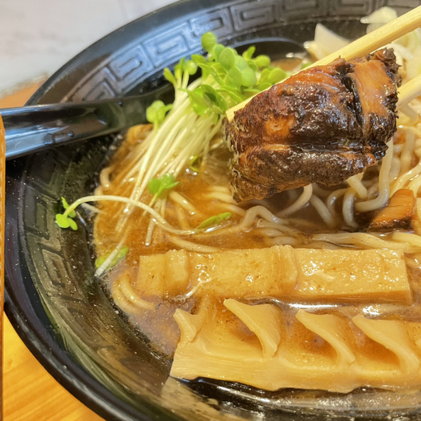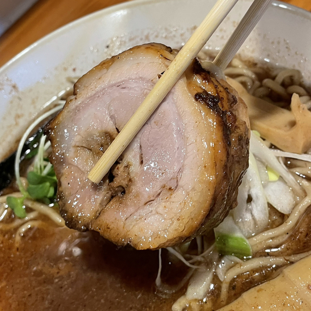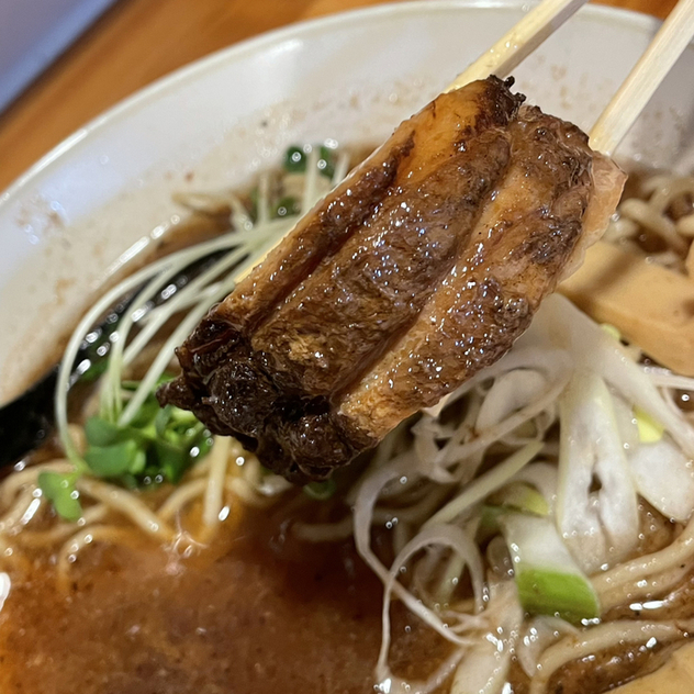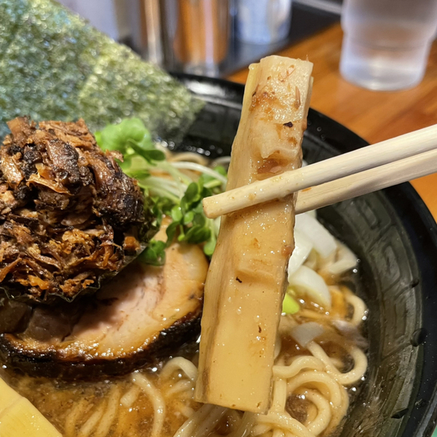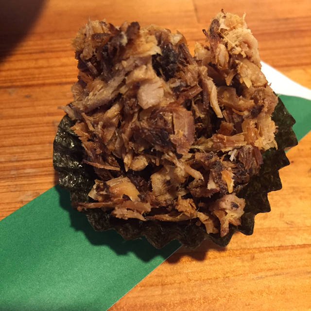 いつものように、チャーシューは厚い。メンマも大きい。おまけのほぐし肉は海苔ちに載せて出される。