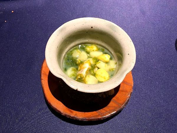 海栗の半張り蒸し 蛤とホワイトアスパラ、生海苔の餡