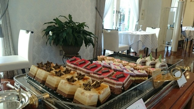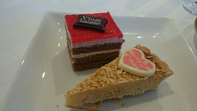 メインは魚料理2種、肉料理2種から選べて、ケーキも選ぶのが迷うくらい宝石箱みたいなケーキが並んでいます。