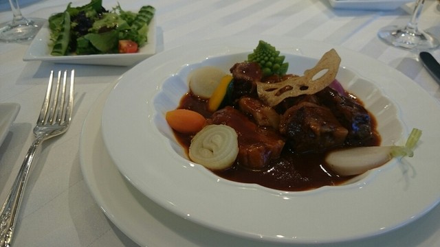 田舎のホテルレストランなので、軽い気持ちで行ったらこれが大間違い(^-^; フランス料理的テーブルセッティング、店員さんたちの教育が徹底&洗練されていて気持ちのいい接客だったけど、逆に粗相をしてはいけないとそっちにばっかり気がいってしまい(笑)緊張しっぱなしでした(^-^;